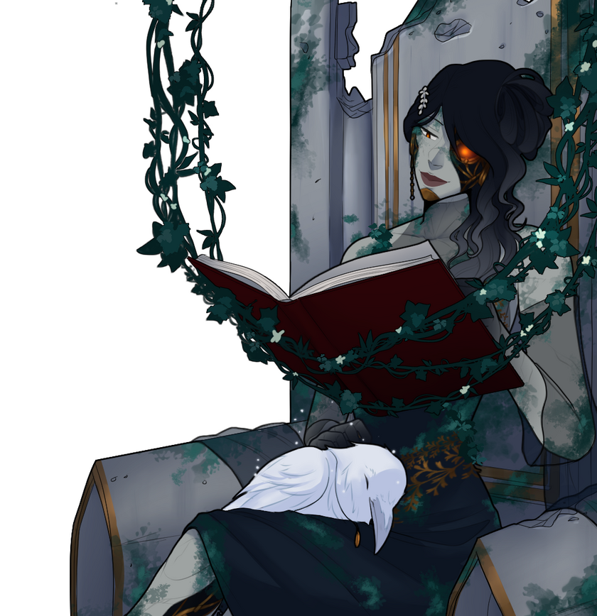 Chapter IV — The SoulhollowThe Soulhollow is not, nor can it ever be, a place of mortal dwelling. It lies beyond the chronology of the living and gods, unmoored from the passage of time and untouched by the decay of seasons. Scholars classify it as a divine liminal realm: an expanse suspended between life and death, neither afterlife nor living world, but something older, quieter, and far more deliberate.Descriptions gathered from myth and surviving scripture speak of a vast forest of pale, bone-white trees whose branches weave into a canopy of mist. Moss and creeping vines blanket the ground in shades of muted green, soft enough to swallow footsteps whole. Pools of unmoving water rest like obsidian mirrors, reflecting a sky devoid of stars. Even the air is still, as though the Hollow inhales but never exhales. Its beauty is said to be both breathtaking and unnerving, a serene hush that lingers long after the tale is told.It is within this place that the last remnant of the forgotten veiled goddess resides: an android caretaker known as the Warden of the Hollow: Roman. Though forged by divine hands, she holds no dominion over the realm she tends; the Soulhollow persists quietly on. Many speculate the influence Roman possesses stems only from the fragment of divinity embedded within her, a spark that allows her to maintain the boundary between realms. This boundary ensures that the living rarely, if ever, step beneath the Hollow’s ancient boughs.For those who do, however (whether by accident, ritual, or misfortune) the cost is inevitable. Devoid of the goddess’s full protection, vitality decays, breath diminishes, and flesh falters until nothing remains but the soul. It is believed Roman can slow this unraveling for a time, but cannot halt it; her power is a breath of the goddess's, not a replacement. Thus, the Hollow remains a sanctuary only for the dead, the nearly departed, and the one who stands eternal between worlds.