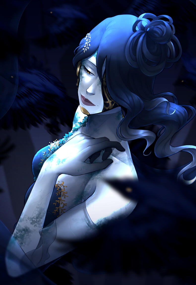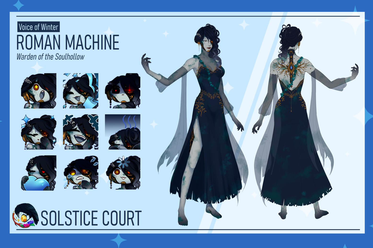 The last remnant of a forgotten goddess, Roman keeps vigil in the quiet of the Soulhollow: a realm where fading memories and last lights settle like snow. It was Roman that first drew the other Solstice Court together and called upon their powers to protect the realms. As the Warden of the Hollow and Voice of Winter, she guides lost souls, shelters wandering spirits, and tends to the held breath between worlds. Through her streams, Roman reaches out beyond the Hollow's borders, letting her soulseekers find a place of rest, warmth, and small moments of joy by her side